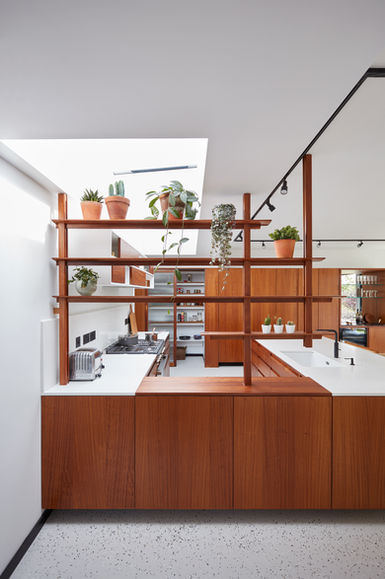 But the show-stealer was a set of bespoke, handmade shelves that screened the kitchen from the hallway in this open plan home. Subtly detailed, like only real furniture-makers can, with traditional jointing and mid-century radiused edges.