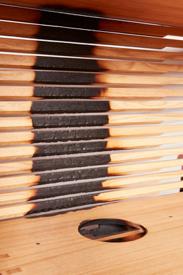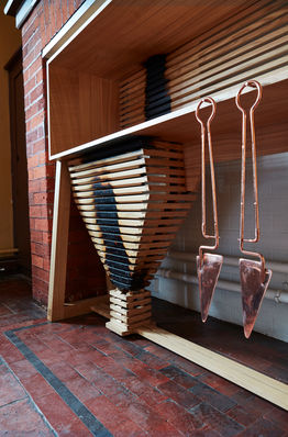 The concept of the design is based on a quote by Austrian composer Gustav Mahler: ‘tradition is the tending of the flame, not the worshiping of the ashes’. This sentiment sits hand-in-glove with the brothers’ interpretation of Morris’ ethos for the Arts & Crafts, the movement from which Red House is an exemplar, where Arts & Crafts philosophy was not about ‘worshiping the ashes’ of times gone by, or lamenting progress, or shunning technology. It was, in Hugh and Howards eyes, about ‘tending the flame’ of craftsmanship, in a symbiotic relationship between a maker’s head, heart and hand. The brothers’ design was a call to tend this flame, both metaphorically and literally, in that the partial ‘burning’ of the work was an integral aspect to its concept and making.